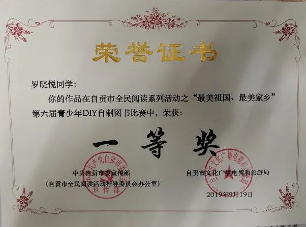 學(xué)生獲自貢市第六屆青少年DIY 自制圖書比賽一等獎。